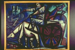 - NOTIZIE STORICO CRITICHE Alla XIa edizione del Premio Suzzara (1958) vinse una forma di formaggio grana, 25 kg. di pasta all'uovo e un mbiletto portafornello.\nLa resa del soggetto mostra derivazioni dall'espressionimo tedesco, evidente nell'illuminazione fredda e livida, associato ad un finissimo senso della stilizzazione. I toni generali sono cupi, con un'accensione nella figura del cavallo, fulcro drammatico della composizione.\nL'artista nasce a Firenze nel 1905. Figlio del pittore Otto, è a contatto fin da piccolo con pesonaggi della cultura e dell'arte europea. Inizia a studiare pittura solo nel 1930, esponendo per la prima volta a Dresda nel 1932. Frequenta l'Accademia di Dresda, è allievo di Otto Dix e poi suo assistente. Nel 1937 14 sue opere vengono bruciate e l'artista decide di lasciare la germania. Giunto a Milano stabilisce contatti con gli artisti di "Corrente", partecipando alle loro esposizioni. E' costretto a fuggire a roma, dove trascorre anni di miseria e di angoscia. Fin dalla Liberazione collavbora con i periodici "Folla", "Il Cosmopolita" e "Il Politecnico". A causa di una malattia polmonare abbandona la pittura per la ceramica. Giò Ponti lo presenta alla XI Triennale di Milano, dove è ordinata una sua personale di ceramica. Dalla fine degli anni Cinquanta Hettner si dedica all'insegnamento.