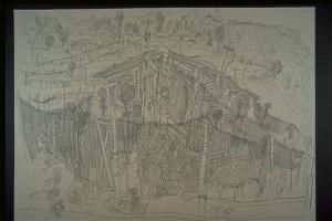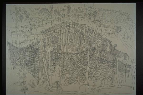 Il pollaio. Piccola costruzione circondata da una recinzione inserito in un paesaggio campestre