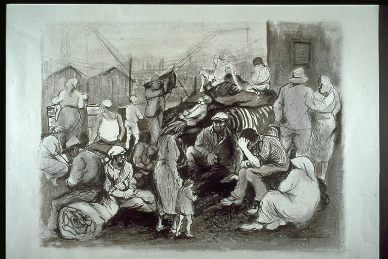 Gli emigranti. Folto gruppo di persone vestite poveramente