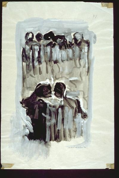 - NOTIZIE STORICO CRITICHE Il disegno fa parte della serie "Storia ddl Fascismo". Per gli altri disegni presenti nella collezione della Galleria civica d'Arte Contemporanea di Suzzara, vedere schede 77/78/79\nL'opera venne donata in occasione della personale del 1983.\nL'opera, come le altre della serie , presenti nella collezione, si situa nella fase della produzione di opere antifasciste dell'artista collocabile dopo le liriche evocazioni del mondo pastorale abruzzese, allorchè la sua espressione si volge verso una eccitata, emblematica cronaca figurata della condizione umana nella vita civile dell'epoca, che coincide con l'assunzione di modi gestuali e di violenze para-informali, giustificati peraltro dalla coscienza e dal patetico giudizio sulla realtà esistenziale.\nNacque il 25 aprile del 1918 a Roma. Studiò a Pescara, a l'Aquila, a Roma e frequentò la Scuola d'Arte di Urbino; compì viaggi di studio a Firenze, Parigi e Venezia, sino a trasferirsi stabilmente a Milano. Amante dell'arte e della cultura ha costituito un museo d'arte moderna a Lido di Spina ove sono raccolte opere dei maggiori artisti contemporanei d'ogni\n nazione. Nelle opere giovanili fu particolarmente descrittivo e lirico, è un grande pittore ispirato all'impegno politico e civile, si richiama all'espressionismo con chiari intendimenti informali, la sua pittura utilizzò caratteri espressionisti nell'ambito della Nuova Figurazione. Ha conseguito importanti riconoscimenti a Milano alla Biennale di Venezia e alla Quadriennale di Roma in diverse edizioni, alla mostra d'arte italiano al Cairo, alla Biennale di San Paolo del Brasile, alla mostra internazionale del secondo Novecento a Parigi ai Musei d'Arte Moderna di Trieste a Palermo. E' stato Presidente della Triennale di Milano. Ha dipinto grandi opere a carattere ciclico e a tema sociale e politico, di grande vigore il ciclo Storia del Fascismo (1957-62 ). Ha allestito grandi pannelli per scenografie sino a recenti opere per l'Arena di Verona. Dipinge prevalentemente figure,volti e paesaggi, tra i temi più noti possiamo ricordare: "Venezie"; gli"Oppositori" e i "Pastorelli".