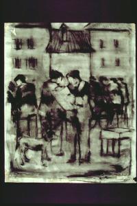 - NOTIZIE STORICO CRITICHE Con uno stile bozzettistico e molto chiaroscurato, l'artista delinea una scena paesana, dove le figure sono rese solo a mezzo di rapidi contorni e tratti insisititi ne sottolineano i valori chiaroscurali.\nL'artista è nato nel 1932 a Milano. Ha cominciato ad esporre nel 1959. Nato come pittore, era "partito da una figurazione che trovava un rinnovamento espressivo nella dissolvenza delle forme in una trama di segnie e di coaguli cromatici." Subentravano successivamente elementi dell'informale. con la mostra milanese all'Agrifoglio, nel 1975, è ancora impegnato in ricerche pittoriche, ma già comincia ad affacciarsi una "nuova" idea della macchina. Il movimento sarà lo stimolo che porterà verso la scultura; il suo percorso si snoda in vari progetti , come quello del Parco per la Biennale di Venezia, quello scultoreo per Piazza Giovine Italia a Milano, quello per i Giardini di Via Palestro. esistono tuttavia anche avanzate lavorazioni , a riprova di una volontà e capacità totale di integrazione e propensione verso nuovi linguaggi.