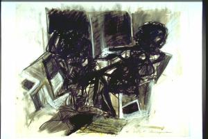 - NOTIZIE STORICO CRITICHE Alla XIVa edizione del Premio Suzzara (1961) vinse un rasoio elettrico e due premi in denaro, uno di £.10000 e l'altro di £. 20000.\nRappresentazione che, tramite un tratto molto denso materico e veloce , tra l'abbozzo e il viscerale, mira a esplicare una dimensione esisenziale di straniamento e di isolamento. La descrizione dell'ambiente è aprospettica , i mobili sono resi tramite segni gravi e intricati, facendo così risaltare la solitudine della figura. \nL'artista nasce a Salò (BS) nel 1933. Nel 1958 si diploma a Brera. Nel 1957 vince il primo premio per il disegno al IV Premio Diomira. Fino al 1965 insegna educazione artistica e lavora nella pubblicità. Formatosi nel clima della Nuova Figurazione della seconda metà degli anni Cinquanta, mette a punto una pittura determinata dall'incontro dell'osservazione dal vero con la dimensione della memoria, dell'emozione e dell'elaborazione mentale. Del '62 è il ciclo di pastelli dal titolo "La Sena", concepiti a §PArigi, in cui si immagina il fiume brulicante di cadaveri. Tra il '63 e il '65 avvia la prima serie di "Animali nel paesaggio". Nel '68 inizia la serie delle "Isole" , nodo iconografico e formale della sua figurazione: elementi sia del paesaggio che oggetti della vita quotidiana che si raggrumano al centro della composizione, isolate dallo spazio intorno. Verso la fine degli anni Settanta avvia la serie delle "Montagne", che prosegue anche negli anni Ottanta parallelamente alle nature morte di frutti e dei paesagi e vedute, all'incrocio tra postimpressionismo ed espressionismo.