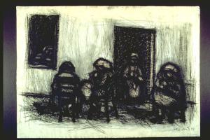 - NOTIZIE STORICO CRITICHE Alla XVIa edizione del Premio Suzzara (1963) vinse un fornello, £. 10000, due volumi del Touring club Italiano e una bilancia pesa persone.\nLa resa è di tipo incisorio, visto l'utilizzo di tratti fini ed insistiti, che si incrociano a generare le forme, con una netta contrapposizione tra le figure, la porta e la finestra, definite con un nero quasi totale, e l'ambientazione esterna, resa con pochi tratti e lasciata al livello del bianco del foglio.