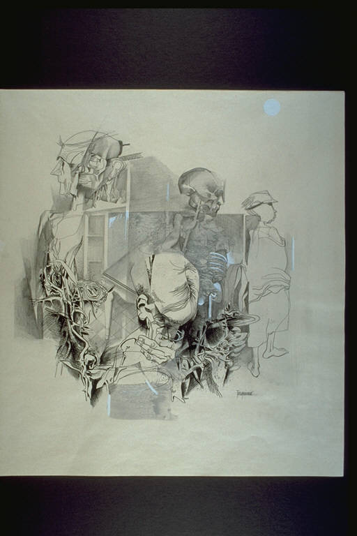 - NOTIZIE STORICO CRITICHE Alla XIXa edizione del Premio Suzzara (1966) vinse £. 50000 in libri.\nCon una figurazione di stampo visionario ed onirico, di forte suggestione, l'autore presenta la tragicità della condizione umana nella sua dimensione quotidiana.