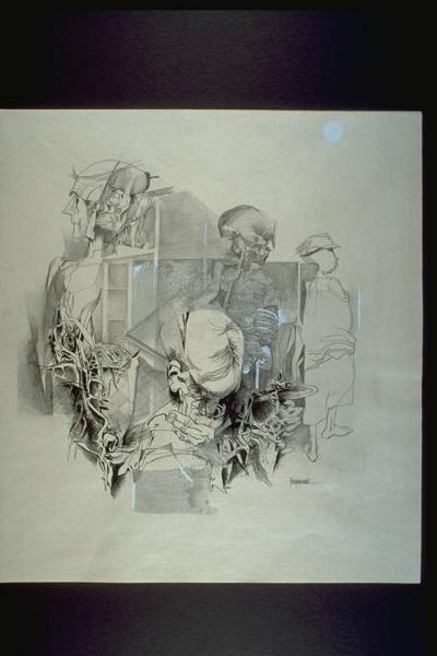 Giorno dopo giorno. Composizione di elementi vari, tra cui spiccano scheletri, fantocci umani, strutture semi-vegetali e scene d'interno