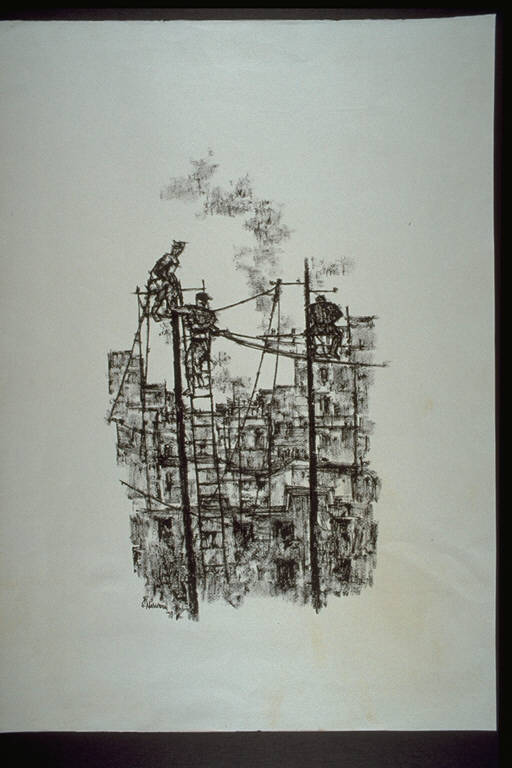 Racconto n°4. Tre operai al lavoro su tralicci elettrici Sfondo urbano