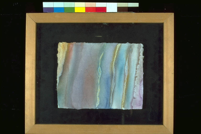 - NOTIZIE STORICO CRITICHE L'opera pervenne alla Galleria in occasione della mostra "Otto giovani artisti in galleria".\nL'artista è qui impegnata in stesure di colore che mimano una materia ora liquida, ora rarefatta, trasparente ed atmosferica. Il paesaggio è sparito , diventato sostanza di colore impalpabile ; il supporto diventa pelle della pittura e, assecondato nei suoi effetti di texture, si fa di nuovo "paesaggio".\nL'artista nasce a Bagnolo San Vito (MN) nel 1952. Diplomata presso l'Istituto d'Arte di Mantova. Negli anni Settanta si concentra sui mezzi lirico-espressivi dell'acquerello in funzione di vari supporti: veline, carte di varia granulometria e capacità assorbente. Nel 1985 partecipa alla mostra "Sulla linea del'orizzonte", alla Casa del Mantegna ; l'anno successivo è invitata al XXXVII Salone della "Jeune Peintutre" al Grand Palais di Parigi . Prevale ancora negli anni Ottanat un referente al paesaggio padano, percepibile anche nella dominante orizzontale delle carte e della figurazione, ma il racconto è sempre più simbolico e la strada astratta è , negli anni Novanta, il suo approdo. Del 1992 è la personale all'Atelier d'Arte Ducale "Papiers dorée"; l'anno seguente esegue un'installazione nel percorso dei giardini a Palazzo Ducale. In questa fase, l'opera è concepita come evento , anche effimero, allusivo a un paesaggio intimo interiore, dove trova la possibilità di coniugare la propria sensibilità con le suggestioni dell'arte antica.