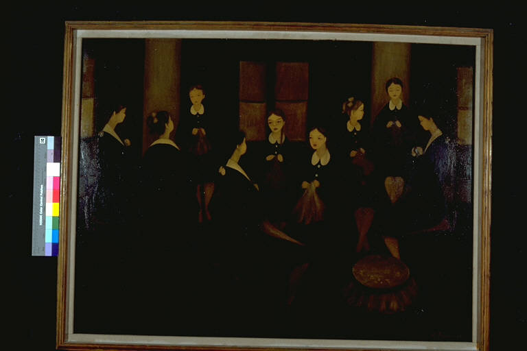 - NOTIZIE STORICO CRITICHE Al IX° Premio Suzzara (1956) vinse un taglio soprabito da donna, un fornello, un ciclo per bambini, una medaglia d'argento e lire 10.000.\nEstrema sobrietà sia nella composizione, che nell'uso di poche tonalità di colore. L'artista descrive con essenzialità e in una visione rasserenata un momento di vita quotidiana femminile. \nL'artista nasce a Mazara del Vallo (Trapani). Compie studi classici. Si avvia all'arte da autodidatta. Comincia ad esporre solo nel 1952 con un linguaggio già maturo. I suoi soggetti sono monache e scolare colte in vari momenti dell'operare quotidiano. I suoi colori sono austeri, connotati da stesure rapide ed essenziali. Nei suoi interni si coglie un'atmosfera assorta. Pur nelle semplicità del suo linguaggio cge ricorda la pittura primitivista, dispone figure e piani secondo un preciso ordine geometrico. Lo studio delle figure è acuto e risolto con limpida semplicità, i colori, ben armonizzati, sottolineano il clima intimista delle scene. Le sue composizioni, per l'uso degli ovali dei volti, per gli occhi ampi e neri tagliati a mandorla, e per il modo di chiudere le figure in vesti che mancano di pieghe e panneggio, possono richiamare l'arte di Modigliani. Questa semplicità della linea richiama anche la tradizione pittorica italiana del '300 e '400. Questi modelli li trae dall'osservazione diretta delle opere d'arte dei musei italiani da lei frequentati durante ogni vacanza. Dal 1952 ha esposto in varie rassegne nazionali (Premio Zavattini, Premio Michetti, Premio Suzzara, Premio Marzotto, Quadriennale di Roma ecc.).