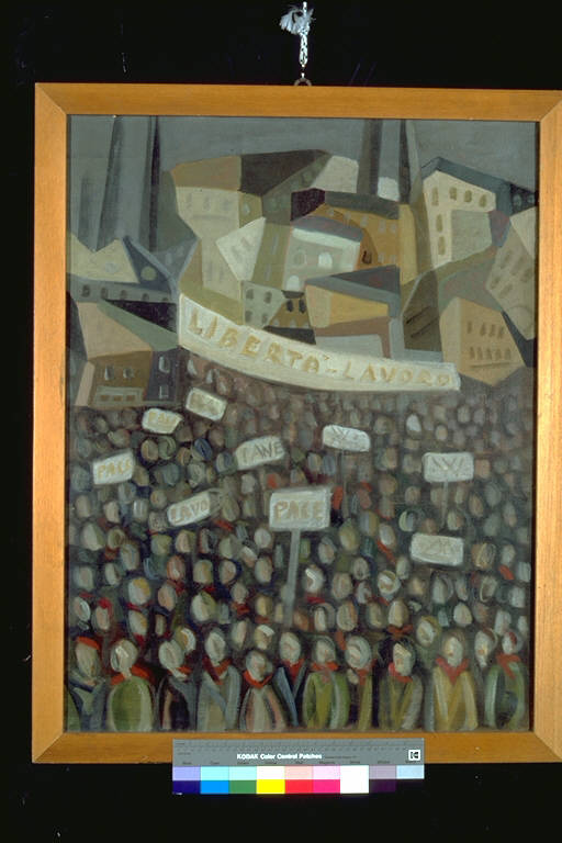 - NOTIZIE STORICO CRITICHE Alla II edizione del Premio Suzzara (1949) vinse due cassette di colori.\nLo stile, per l'uso di una prospettiva rovesciata e per la tendenza ad una definizione geometrica delle forme, evidente nella rappresentazione del paesaggio urbano sullo sfondo, è di derivazione cubista. La scelta di un soggetto di carattere politico e sociale espresso attraverso un linguaggio moderno, inseriscono l'opera nell'ambitio delle istanze del Fronte Nuovo delle Arti.\nL'artista nasce ad Umbertide (PG) nel 1912. All'Accademia di Belle Arti di Bologna frequenta le lezioni di Virgilio Guidi. Nel 1942 apre la Galleria Ciangottini a Bologna dove presenta De Pisis, De Chirico, Morandi, Rosai, Guidi, Semeghini ed altri giovani artisti bolognesi. Nel 19el 1946 apre la Galleria La Cupola sempre a Bologna. Nel 1948 è presente alla XXIV Biennale di Venezia e alla storica mostra dell'Alleanza della Cultura a Bologna, che segna la disgregazione del Fronte Nuovo delle Arti. Continua a partecipare a mostre importanti e, negli anni '50, a diverse edizioni della Biennale di Venezia e alla Quadriennale di Roma. Nel 1959 apre una terza galleria, Il Cancello, a Bologna, dove presenta giovani artisti emergenti. Nel 1964 ottiene una sala alla Biennale di Venezia. Negli anni successivi si avvicina sempre più all'Informale. Nel corso degli anni '70 partecipa a varie mostre personali e collettive.