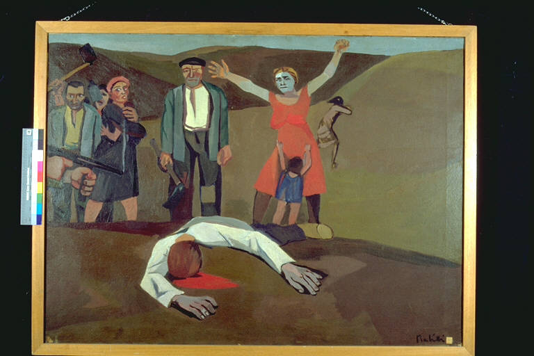 - NOTIZIE STORICO CRITICHE Al III° Premio Suzzara (1950) vinse 100 mq. di legno compensato.\nQuadro, probabilmente, ispirato agli eventi dell'occupazione delle terre in Sicilia. Lo stile, tendente ad una definizione delle forme semplificata e angolosa e ad una certa caratterizzazione espressiva dei volti si riallaccia al realismo Guttusiano di matrice picassiana.La scelta del tema inserisce l'opera nell'ambito di un realismo di forte impegno sociale. La scena della fucilazionee, in particolare, la figura con le braccia alzate al centro dellla composizione, sembra richiamare, iconograficamente, "Il 13 Maggio 1808" di Francisco Goya.