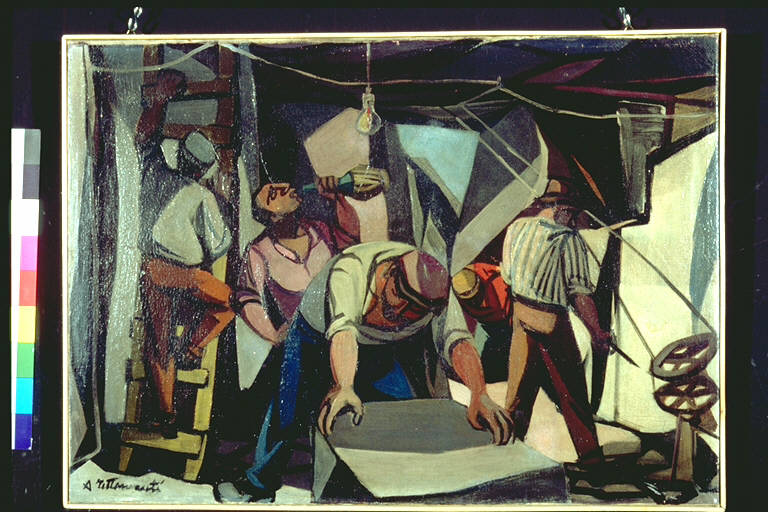 - NOTIZIE STORICO CRITICHE Al III° Premio Suzzara (1950) vinse L. 25.000.\nL'artista, attraverso un impianto narrativo e un linguaggio di derivazione cubista, descrive senza drammaticità diversi aspetti del lavoro all'interno di una miniera.\n Nasce a Laveno (VA) nel 1914 e muore ad Ancona nel 1961. Autodidatta. Espone per la prima volta a Milano nel 1937. Negli anni Quaranta partecipa a varie edizioni del Premio Bergamo e della Biennale di Venezia. Nel dopoguerra partecipa a molte esposizioni del gruppo dei realisti milanesi presso le gallerie 15 Borgonuovo, Bergamini e Spotorno. I soggetti delle sue opere sono legati a tematiche sociali oppure sono di tipo tradizionale, come nudi e nature morte. Nel 1951 partecipa alla Rassegna di pittura contemporanea italiana (Premio Città di Bologna). Nei primi anni Cinquanta le sue opere mostrano il passaggio da un linguaggio post-cubista ad un linguaggio di matrice espressionista con cui l'artista descrive le periferie milanesi. Nel 1948, nel '52 e nel '55 partecipa alla Quadriennale di Roma. Durante tutti gli anni Cinquanta espone in diverse altre personali e partecipa a molte edizioni del Premio Suzzara, prediligendo sempre più le tematiche sociali (uomini al lavoro, fabbriche, quartieri periferici). In seguito ad un viaggio in Cina, fatto nel 1957, il suo linguaggio artistico si rinnova attraverso un ampliamento della composizione, una più rapida definizione delle forme e una stesura del colore più corposa e precisa. Nel '58 vince il Premio Modigliani e nel '61 il Premio Ramazzotti. Nel 1965 gli viene dedicata una antologica a Suzzara, e nel '73 una al Circolo Contardo Barbieri di Broni.