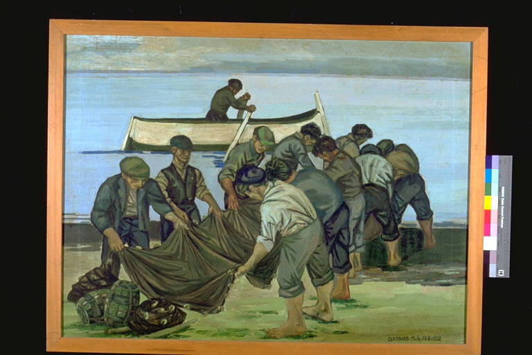 Pescatori. Pescatori con reti in riva al mare