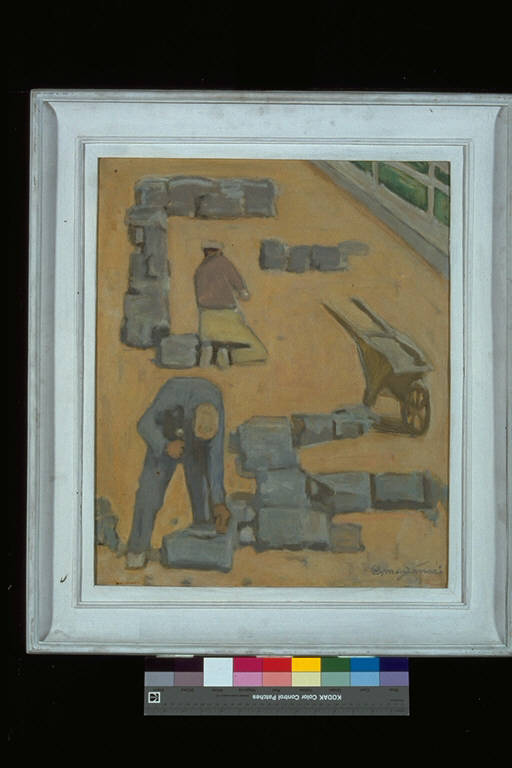 - NOTIZIE STORICO CRITICHE Alla VI° Premio Suzzara vinse una cucina economica e mezza forma di formaggio grana.\nLo stile è essenziale. La definizione delle forme tende al geometrico. Il colore è impostato su tonalità molto chiare. L'opera ripropone il tema courbettiano degli spaccapietre privandolo, attraverso uno stile molto più pacato e non espressivo, di ogni connotazione drammatica. Il tema del lavoro viene, qui, visto in maniera distaccata e serena.\nL'artista è nato a Osimo (Ancona) nel 1889. Studia all'Accademia di Belle Arti di Brera, di cui sarà socio onorario nel 1923. Dal 1922 partecipa a mostre italiane ed estere: Biennali, Quadriennali, mostre internazionali a Pittsbourgh, Chicago, Cleveland. New York, San Francisco, Buenos Aires, Amsterdam, Monaco, Ginevra, Parigi, Vinna, Budapest, Praga, Madrid, Atene, Varsavia, Bucares, Barcellona. Vince molti premi, tra cui, nel 1925, la medaglia d'oro del Ministero della Pubblica Istruzione alla Biennale di Brera, e nel 1957, il Premio "Fondazione Feltrinelli" alla biennale di Milano.