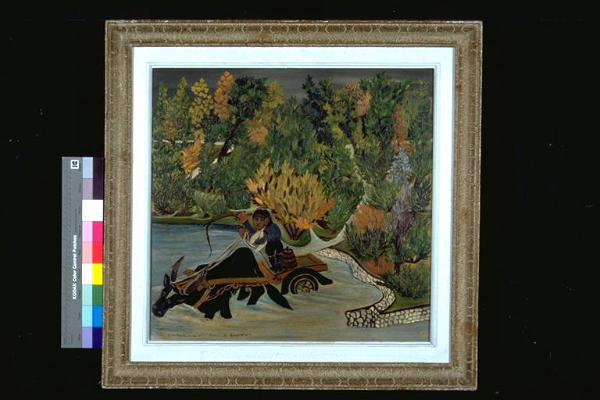 Contadino al guado. Paesaggio rurale, con fiume e sponda boscosa; in primo piano, un carro trainato da un bove e guidato da un contadino