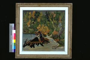 - NOTIZIE STORICO CRITICHE Al VI° Premio Suzzara (1953) vinse un fornello a gas completo di apparecchiatura, un assegno al portatore di lire diecimila, un prosciutto, mezza forma di formaggio grana e due bottiglie di liquori.\nLo stile dell'artista, in quest'opera, giunge a piena maturazione. La natura è vista come una grande forza vitale. All'atmosfera fiabesca, incantata, suggerita nei primi dipinti, si sostituisce una visione più inquietante, al limite dell'allucinazione.\nL'artista nasce a Gualtieri nel 1907. Durante la Seconda Guerra Mondiale combatte su diversi fronti (Africa Orientale, Spagna, Albania). Rimasto ferito, viene ricoverato per tre anni all'ospedale di Sant'Anna di castelnuovo Monti. Inizia a dipingere nel 1949 col sostegno di Mazzacurati , che organizza la prima mostra personale del pittore a Roma. Solitamente Rovesti si firma con la sigla "Pittore contadino ce." ("ce." sta per celebre). Egli si riterrà sempre "originale", in contrapposizione ed in polemica con gli altri pittori naifs, che riteneva fasulli. Sul retro della tela racconta il suo mondo, il Po e la sua campagna, con brevi scritti esplicativi. Nei suoi quadri predominano sempre un'atmosfera fiabesca, un cromatismo acceso ed un senso profondo del decorativismo. In tempi più recenti, terrorizzato dalla minaccia della bomba atomica, ha dipinto gli effetti devastanti da essa prodotti, ispirandosi alle scene dell'alluvione del Po e a ciò che aveva provocato nei suoi luoghi.