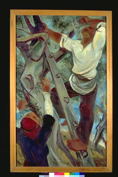 Raccolta delle olive. Figura maschile, arrampicata su di una scala, ed una figura femminile raccolgono olive da un albero