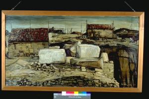 Nelle cave di Aurissina. Rappresentazione di una cava, con varie capanne e grossi blocchi di marmo