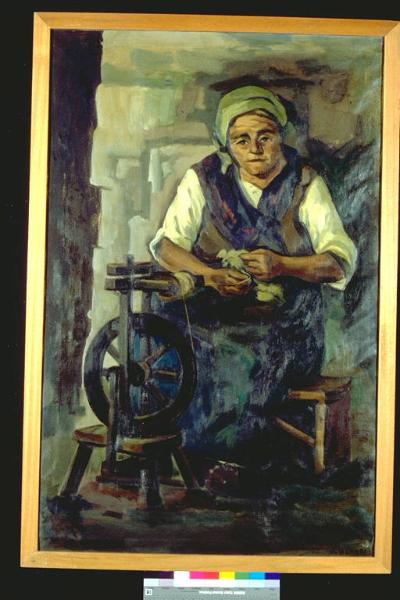 - NOTIZIE STORICO CRITICHE Al XIII° Premio Suzzara vinse una forma di formaggio grana, kg 5 di salamelle, kg 5 di salumi, kg 25 di pasta alimentare, un ciclo per bambini e lire 10.000.\nL'uso di colori cupi, la rappresentazione di un ambiente povero, la caratterizzazione espressiva della figura, e la descrizione pietistica della condizione di lavoro della vecchia filatrice, inseriscono l'opera in un realismo di derivazione ottocentesca, e fanno pensare a dipinti come: "La filatrice" di Millet del 1850-1855, o a quella di Wilhelm Leibl del 1892.\nL'artista è nato a Loreto (Ancona), nel 1904, e morto a Milano, nel 1992. Lavora come decoratore-affrescatore prima a Loreto e poi a Piacenza. Dal 1925 si trasferisce a Milano, dove frequenta i corsi serali di pittura all'Accademia di Brera e al Castello Sforzesco. Nello studio milanese di via Solferino ha frequenti contatti con Birolli e altri artisti esponenti di "Corrente", come emerge dai ritratti e dalle nature morte dei primi anni '30. Dal 1933 si dedica all'attività grafica, realizzando tempere, collages, disegni, manifesti, e pannelli per varie vetrine e vari enti: fiere di Milano e Bari, triennali di Milano e Napoli, Expo International di Parigi. Negli anni '30 e '40 la sua arte grafica è caratterizzata da un notevole sperimentalismo.Negli anni '40 realizza opere che prendono spunto dalla distruzione della guerra, e vari pannelli polimaterici. Negli anni '50 abbandona lo sperimentalismo eclettico e si concentra su temi tradizionali(maternità, nature morte, paesaggi marchigiani), e su disegni eacquerelli dai moduli astratto-surrealisti. Partecipa a varie edizioni del Premio Bergamo, della Biennale di Venezia, e della Quadriennale romana.Tiene mostre personali in molte città italiane e straniere (Milano, Ancona, New York, Losanna, Parigi).