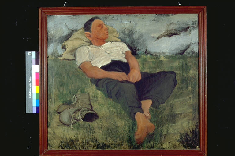 - NOTIZIE STORICO CRITICHE Al VIII° Premio Suzzara vinse £50.000 in contanti.\nLa figura è leggermente scorciata, disposta in diagonale. Stilisticamente l'opera è avvicinabile al primo Ben Shan. \nNato a Monza nel 1930; studia presso l'Accademia Cimabue di Milano. Dal 1952 tiene personali in Italia e all'estero; dal 1953 partecipa a collettive e premi: 1955-1957 è premiato al Suzzara; partecipa alla Biennale dell'incisione contemporanea (Venezia 1961, 1965); alla IX Quadriennale di Roma (1965); alla XXXI e alla XXXIII Biennale di arte contemporanea di Venezia (1962, 1966):queste per citare solo alcune delle sue tappe. Già attorno al 1955, insieme ai giovani usciti dall'Accademia di Brera, Ceretti, Romagnoni, Vaglieri, Guerreschi, impegnati in una "figurazione" tesa ad una continuità delle trascorse esperienze informali, Cazzaniga elabora un tipo di pittura di intima e tormentata espressione: grovigli di segni lasciono affiorare brandelli di natura o "cultura", a seconda che l'artista tratti le sue tematiche preferite, oscillanti tra i cupi paesaggi del sottobosco e i "ritratti" di oggetti metropolitani: basti ricordare la bella serie dedicata agli strumenti musicali.