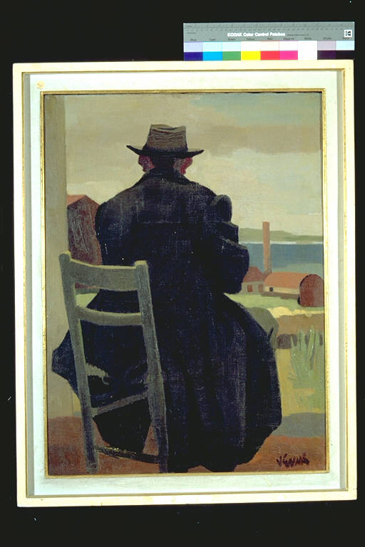 Vecchio operaio. Uomo seduto, di spalle Sfondo paesaggistico