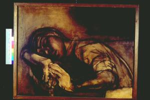 Bracciante che riposa. Figura maschile dorme con il capo appoggiato ad un braccio