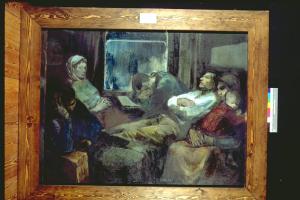 - NOTIZIE STORICO CRITICHE Al IX° Premio Suzzara vinse un fusto di vernice, una forma di formaggio grana, un ciclo per bambini e L.20.000\nLo stile descrittivo è privo di enfasi e coglie con oggettività un momento di stanchezza di un gruppo di emigranti operai durante un lungo viaggio notturno. La scelta di una gamma cromatica impostata prevalentemente sui grigi aumenta l'effeto di povertà, sia dell'ambiente, che delle persone. Lo stile, come in certa pittura realista della metà degli anni Cinquanta, riprende, sia pure con una certa libertà espressiva, i modi ottocenteschi. In particolare l'opera ha come modello iconografico il "Vagone di terza classe" di Daumier.\nL'artista nasce a Cesena nel 1928. Inizia a dipingere da autodidatta interessandosi all'arte di Viani e Rosai. Dal 1948 al 1953 vive a Roma dove frequenta Muccini e Vespignani. Le opere di quel periodo rivelano una ripresa dei modi ottocenteschi (Fattori, Toma) e un interesse per gli aspetti della vita contemporanea. Studia anche la tecnica e lo stile di Caravaggio. Nel 1956 presenta la sua prima personale alla Galleria Il Pincio di Roma. Per i suoi quadri sceglie temi come interni di cinema, bar, anticamere, uffici. Nel 1957 espone nuovamente a Roma e nel '58 alla Galleria Bergamini di Milano. Nel 1959 partecipa alla Quadriennale di Roma e nel '60 alla mostra "Pittura italiana contemporanea" al Palazzo della Permanente di Milano. La sua pittura dei primi anni Sessanta viene influenzata dall'espressionismo di Bacon e coglie, specie nei ritratti, la condizione di angosciosa solitudine dell'uomo contemporaneo. Durante gli anni Sessanta tiene diverse personli alle Gallerie Bergamini di Milano, La Barcaccia di Roma, Il Vaglio di Firenze e Forni di Bologna. Nel 1970 viene allestita la sua prima mostra antologica al Palazzo del Popolo di Todi. Le sue opere degli anni Settanta e delle prima metà degli anni Ottanta sono caratterizzate da una violenta critica sociale, sotto forma di metafore e allegorie, come nei cicli "La cena", "La famiglia" e "Teatro d'Italia" (con quest'ultimo ciclo partecipa alla Quadriennale di Roma nel 1986). Nelle sue ultime opere riprende il tema della solitudine umana.