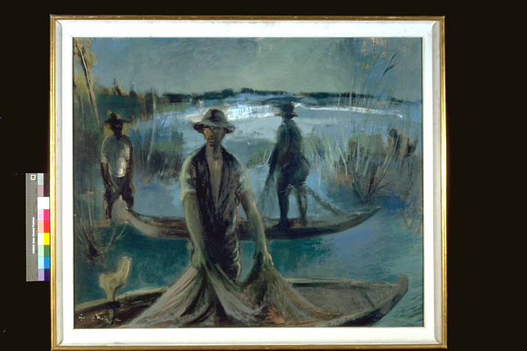 Sulle rive del Po. Tre pescatori con le reti sulle barche in un paesaggio fluviale