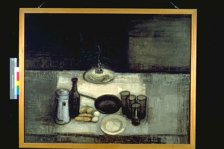 - NOTIZIE STORICO CRITICHE Al XII° Premio Suzzara (1959) vinse il maiale.\nAtmosfera rarefatta e sospesa; gli oggetti da cucina, semplici e poveri, suggeriscono la frugalità della cena. Richiamo allo stile di Morandi. Prospettiva "a volo d'uccello". Toni neutri, con prevalenza del nero.\nL'artista, pittrice e scenografa , nasce a Genova nel 1929. \nAutrice di paesaggi, marine e figure di bambini, tenne numerose personali tra le quali si ricordano quelle di Milano, Galleria Bergamini, 1953; Genova, Galleria San Matteo, 1958; Roma, Galleria del Mulino, 1963; Genova, Galleria Il Vicolo, 1977. A partire dagli anni Sessanta affiancò a questa attività quella di scenografo, particolarmente per il Teatro alla Scala di Milano. Si citano in proposito alcune delle realizzazioni più significative: scenografie per Elektra, Teatro Comunale, Bologna, 1969; scenografie per il balletto Le notti egizie, Teatro della Scala, Milano, 1971; scenografie per Romeo e Giulietta, Arena di Verona, 1977; scenografie per Il Trovatore, Teatro Comunale dell'Opera, Genova, 1980.