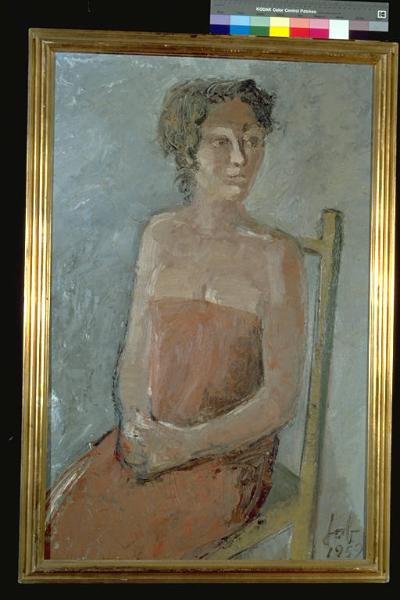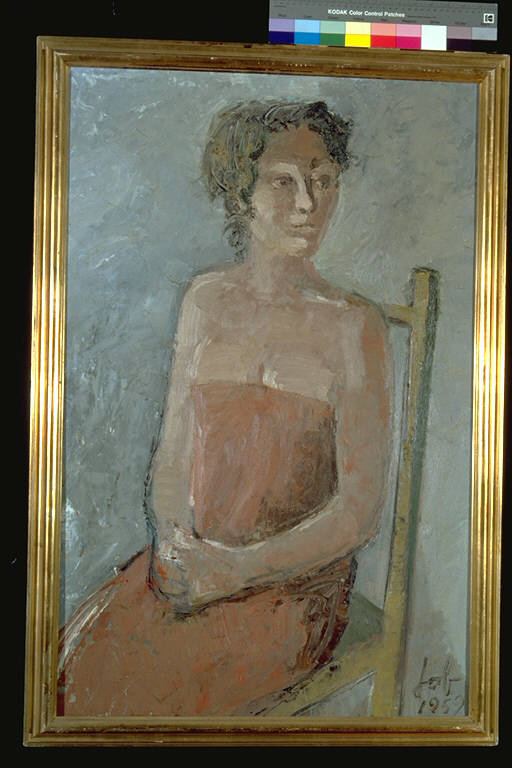 - NOTIZIE STORICO CRITICHE Al XII° Premio Suzzara (1959) vinse una capra.\nLa figura è resa con pennellate veloci e dense, specialmente nella campitura dei capelli, utilizzando diverse tonalità cromatiche, alla maniera espressionistica. I segni sono immediati e nervosi, la prospettiva insicura e lo sfondo livido: tutti questi particolari contribuiscono a generare un'atmosfera di sottile inquietudine.\nL'artista nace a Napoli nel 1934.Dopo gli studi all'Accademia di Brera, aderisce negli anni Cinquanta al Neorealismo: partecipa al Premio Suzzara e tiene la ua prima personale alla galleria La Colonna di Milano nel 1958. In seguito si accosta a una pittura informale con echi surreali. Nel 1960 smette di dipingere e lavora come scenografo.Dal 1968, a Roma, la sua ricerca artistica riprende con l'happening, di cui memorabili restano "Le Metamorfosi" alla Galleria Il Canale di venezia del 1972 e "La Confessione" alla Galleria Lucrezia De Domizio di Pescara. Dal 1983 si dedica completamente all'attività di scenografo.