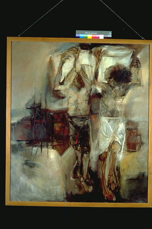 - NOTIZIE STORICO CRITICHE Al XII° Premio Suzzara (1959) vinse un frigorifero.\nL'utilizzo di pennellate immediate, veloci, quasi viscerali, e di toni cromatici freddi e lividi, acuisce la drammaticità della rappresentzione. I manovali sono definiti in maniera sommaria, puntando l'attenzione sulla loro fatica; la costruzione retrostante, dove solo è presente il rosso, è ridotta macchia di colore intersecantesi con linee geometriche.\nL'artista è nato a Viareggio nel 1930, ha frequentato il Liceo Artistico di Carrara ed il Magistero d'Arte a Firenze. Ha iniziato ad esporre nel 1956. Dal 1956 vive e lavora a Milano.