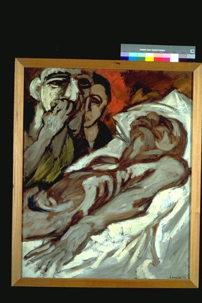 - NOTIZIE STORICO CRITICHE Al XII° Premio Suzzara (1959) vinse L.50.000 e un mobile portafornello.\nDipinto di impianto espressionista: alta drammaticità delle figure, colori lividi, pennellata larga a definire le strutture corporee, deformazione fisiognomica. Lo sfondo si accende di un'aura rossastra, ad aumentare il senso di dolore e sofferenza che pervade tutto il dipinto.\nL'atrista si esprime secondo i modi del realismo esistenziale