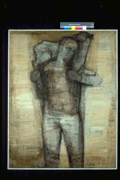 - NOTIZIE STORICO CRITICHE Al XIV° Premio Suzzara (1961) vinse una forma di formaggio grana, L.50.000 e una medaglia d'argento\nLa suggestione classica è evidente nella ripresa della iconografia del Mouskophoros. L'artista utilizza un monocromo dal tono di fondo molto chiaro, contrapposto a contorni ed ombreggiature resi col nero, con una pennellata molto larga e veloce, con scarsissima caratterizzazione formale. \nL'artista, pittrice e scenografa , nasce a Genova nel 1929. \nAutrice di paesaggi, marine e figure di bambini, tenne numerose personali tra le quali si ricordano quelle di Milano, Galleria Bergamini, 1953; Genova, Galleria San Matteo, 1958; Roma, Galleria del Mulino, 1963; Genova, Galleria Il Vicolo, 1977. A partire dagli anni Sessanta affiancò a questa attività quella di scenografo, particolarmente per il Teatro alla Scala di Milano. Si citano in proposito alcune delle realizzazioni più significative: scenografie per Elektra, Teatro Comunale, Bologna, 1969; scenografie per il balletto Le notti egizie, Teatro della Scala, Milano, 1971; scenografie per Romeo e Giulietta, Arena di Verona, 1977; scenografie per Il Trovatore, Teatro Comunale dell'Opera, Genova, 1980.