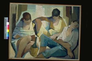 Lavoratori in riposo. Tre figure sedute a terra in atteggiamento di riposo