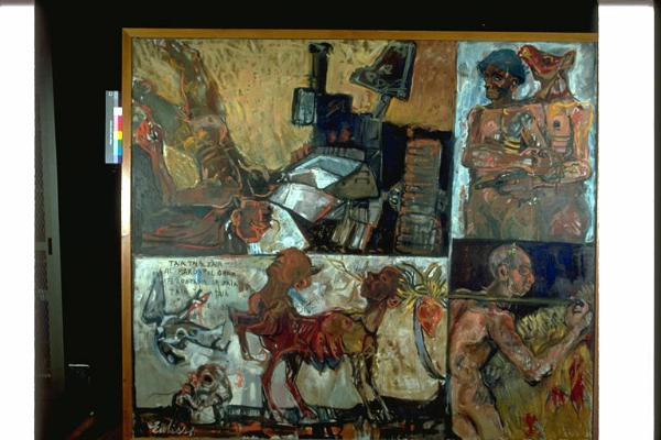- NOTIZIE STORICO CRITICHE Al XVI° Premio Suzzara (1963) vinse il puledro.\nIl dipinto è diviso in quattro scene: la prima occupa la parte maggiore della superficie pittorica e si trova a sinistra, nella metà superiore. Raffigura una figura femminile nuda, riversa a terra, le gambe che escono dai margini del dipinto. Alla sua sinistra, composizione di vari oggetti con elemento triangolare scuro che si staglia sullo sfondo giallo-aranciato. La seconda scena occupa la metà superiore destra del dipinto, ed è più ridotta in larghezza rispetto alla precedente. Raffigura una figura maschile stante, nuda, con elmo in testa. Alle sue spalle, figura stante, nuda, con corpo maschile e testa animale (vitello), con in mano un'arma che viene portata davanti al ventre della prima figura. La terza scena occupa la metà inferiore sinistra, di larghezza uguale alla soprastante. Raffigurata a destra un corpo di quadrupede, con due teste umane alle estremità destra e sinistra. Alla estremità sinistra è inoltre presente una quinta zampa alzata. A sinistra in basso, testa umana calva e in alto elemento di forma irregolare dal contorno blu, interno marrone con colpi di bianco. La quarta scena occupa la metà inferiore sinistra, di larghezza uguale alla soprastante. Raffigura una figura maschile nuda, calva, di profilo, inquadrata fino alla coscia con bastone sulla spalla, ritratta nell'atto di camminare. Da queste figurazioni emerge un quadro genrale di violenza ed oppressione. \nL'artista nasce a Venezia nel 1935. Autodidatta. Il suo stile dei primi anni Sessanta si caratterizza per un espressionismo che si avvicina all'opera di Ensor. Inserisce nelle sue composizioni immagini prese dalla figurazione cartellonistica per approfondire la sua ricerca sul reale.Importante è una profonda coscienza morale e politica che si esprime nelle serie dei collages della Cancelleria del reich o nelle opere dedicate al processo di stoccolma. Del 1978 è un'importante antologica nella Galleria Bevilaqua La Masa di Venezia.