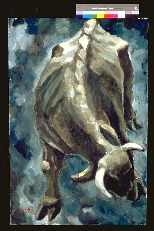 - NOTIZIE STORICO CRITICHE Al XVI° Premio Suzzara (1963) vinse una cucina, i volumi Bompiani, un rasoio elettrico e L.20.000.\nStile realista: il toro, delineato a mezzo di pennellate brevi e larghe che giustappaongono i colori sulle tonalità del nero e del bianco a determinare la struttura dell'animale, emerge da un fondo reso con larghe pennellate dalle tonalità bluastre. Il contorno del corpo dell'animale è inciso.\nL'artista è nato a Terni nel 1938. Dopo gli studi a Milano si traferisce per un breve periodo a Cremona. Dal 1962 viaggia all'estero operando in paesi europei e in Brasile. Ha eseguito opere applicate all'architettura in Italia, Brasile e Cecoslovacchia. Ha partecipato ad importanti rassegne nazionali ed internazionali, tra le quali il Premio Ramazzotti (1964), Premio Michetti (1972), Premio Gallarate (1973 e 1976/77).