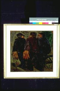 - NOTIZIE STORICO CRITICHE Al XV° Premio Suzzara (1962) vinse L.95.000.\nStile realistico- espressionista: le figure umane si presentano angolose, contornate di nero, ed una grande evidenza è conferita alle mani, seguendo in questo senso una suggestione che proviene da Kokoschka. I colori sono cupi, il fondale si compone di di nervose e disordinate pennellate verde scuro. Il solo colore acceso utilizzato dall'artista è il rosso mattone, per le mani, i volti e gli angoli superiori .\nL'artista è nato a Malvaglio (MI) nel 1931. Ha studiato pittura e scultura all'Accademia di Brera dove ha avuto come insegnanti Domenico Cantatore, Manlio Giarrizzo, Pompeo Borra e Marino Marini.Tra la fine degli anni Cinquanta e i primi Sessanta sperimenta varie ricerche, dalla plasticità delle figure, ad una gestualità che va a scapito dello spessore volumetrico, ad un ritorno alla figura umana attraverso lo studio di Kathe Kollwitz e Mario Sironi. Già da questi anni si manifesta il suo interesse verso la rappresentazione della figura umana, che lo porterà alla realizzazione di opere dichiaratamente antifasciste. Nel 1962 tiene la sua prima personale a Milano ed è premiato al XV Premio Suzzara, a cui partecipaerà con continuità negli anni successivi. Alla fine degli anni Sessanta la gamma cromatica si schiarisce e prevale nei temi un nuovo interesse per la natura. L'attenzione al privato non cancella però l'impegno nel sociale. Nel 1972 esegue a Montechiarugolo un vasto pannello di storia contadina, oltre ad una serie di dipinti che illustrano manifestazioni politiche urbane. In seguito sperimenta soluzioni volumetriche più sciolte, trovando i propri modelli nel quotidiano e negli sport popolari. I nuovi soggetti , senza negare l'attenzione per i volumi, vedono uno sviluppo grafico inedito caratterizzato da una estrema concisione e vitalità. Dedica inoltre una vasta composizione al tema del mare. A pertire dagli anni Ottanta, l'artista pertecipa a varie esposizioni di rilievo.