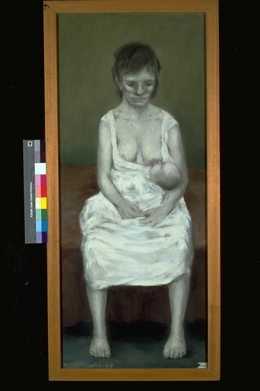 - NOTIZIE STORICO CRITICHE Al XVI° Premio Suzzara (1963) vinse il frigorifero FIAT e una medaglia d'oro.\nOpera inseribile nel filone del realismo esistenziale. L'assenza di supplellettili nell'interno, l'abito semplicissimo, la postura esprimente stanchezza, la caratterizzazione fisiognomica suggeriscono un contesto di modestia e di solitudine. La pennellata è omogenea; la composizione si basa su due colori per lo sfondo, il verde oliva e il marrone, mentre le figure sono rese con un bianco livido; solo nel volto sono ravvisabili piani spaziali accuratamente studiati dall'artista.