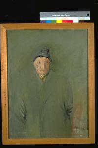 - NOTIZIE STORICO CRITICHE Al XVII° Premio Suzzara (1964) vinse un raffreddatore per bibite e L.30.000.\nIl volto dell'effigiato emerge, con sguardo fisso, da una superficie pittorica trattata unicamente a mezzo di un colore verde oliva, sia nello sfondo che nell'abito e nel cappello. La pennellata è generalmente veloce e omogenea; solo nel viso, si nota l'insistenza del pennello nell'articolare i colori, alfine di rendere i trapassi chiaroscurali, richiamando ancora una volta, nelle ombre, lo stesso verde che impera nel resto del dipinto. \nL'artista è nato nel 1924 a Pinguente ma vissuto sempre a Trieste, inizia a dipingere giovanissimo e ottiene subito buoni riconoscimenti. Partecipa a mostre a carattere nazionale come Quadriennale di Roma, Biennale di Milano, Premio Michetti a Suzzara, Trivenete, Campione d'Italia, Permanente a Torino, Marzotto, Milano, Il nostro Po ed altre. Allestisce personali a Milano, Genova, Venezia, Bergamo, Bologna, Forlì, Bucarest (Istituto Italiano di Cultura), Bruxelles, Monaco di Baviera e antologiche a Udine, Gorizia, Trieste. Premiato in numerose occasioni e segnalato al Premio Bolaffi.