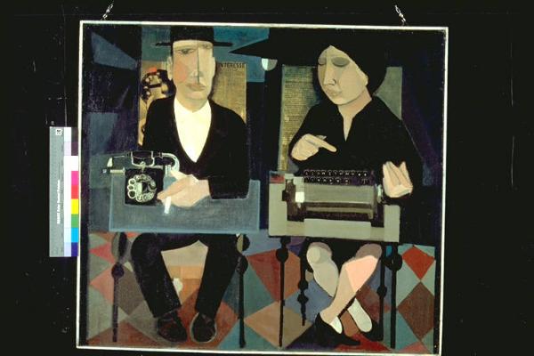 La dattilografa. Una dattilografa a una figura maschile seduta con accanto un telefono
