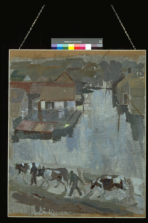 Ricordi del Polesine. Case sul fiume; in primo piano, bovari conducono le loro mucche