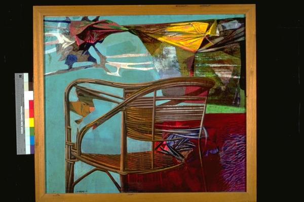 Memoria di un bracciante. Seggiola in vimini; motivi multicolori nello sfondo