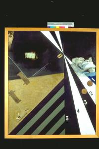 - NOTIZIE STORICO CRITICHE Al XIX° Premio Suzzara (1966) vinse L.90.000, una forma di formaggio grana e 25 kg di salumi.\nOpera che richiama la corrente gestaltica di valorizzazione della macchina e delle nuove tecnologie (gli impianti industriali, la macchina da scrivere, la sonda spaziale). L'influenza delle ricerche neo-dada sono evidenti nei frammenti di collage inseriti sulla tela. Anche le tematiche cinevisuali sono rappresentate, in particolare nel convergere e divergere delle linee che occupano la metà destra del dipinto.
