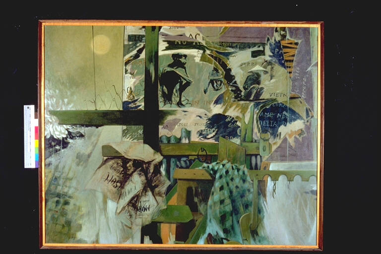 Paesaggio del Delta. Composizione di elementi vari: figure umane, giornali, cartine geografiche, strutture in legno