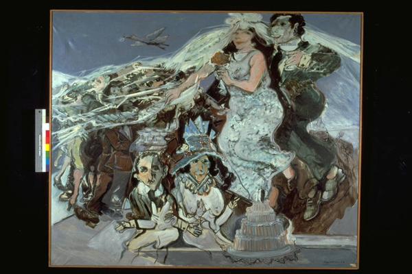 - NOTIZIE STORICO CRITICHE Opera che, nella sua figurazione elementare, evidenzia intenti di derisione grottesca degli usi e costumi standardizzati; lo sposo ha un volto animalesco; gli invitati sono presentati come fantocci dalle gesta scomposte , con un richiamo in questo senso a certe scomposizioni dell'espressionismo tedesco da Schiele e Kokoschka; la sposa, nella sua sua apparente leggiadria, è deturapata da braccia maschili e orribilmente lunghe. \nL'artista nasce a Palermo nel 1928, vive e lavora a Milano