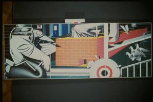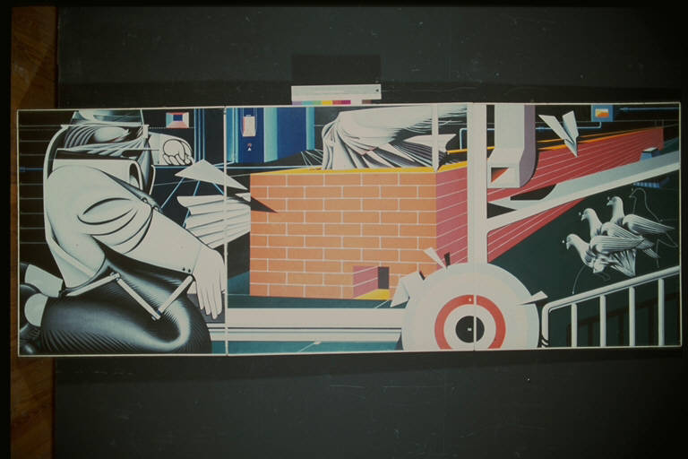 - NOTIZIE STORICO CRITICHE L'opera vinse il puledro al Premio Suzzara 1967. Essa risale al momento più creativo dell'artista, ispirato dal Pop americano e soprattutto dal fumetto al quale più tardi dedicherà la sua attività. L'immagine, nella quale sono presenti richiami pubblicitari e soluzioni grafiche, è strutturata secondo una macchinosa costruzione formale che si articola attorno alla costruzione in mattoni. La figura umana dalla testa mostruosa rappresenta l'alienazione dell'uomo nel costruire un ambiente che rimane a lui stesso estraneo ed impraticabile.