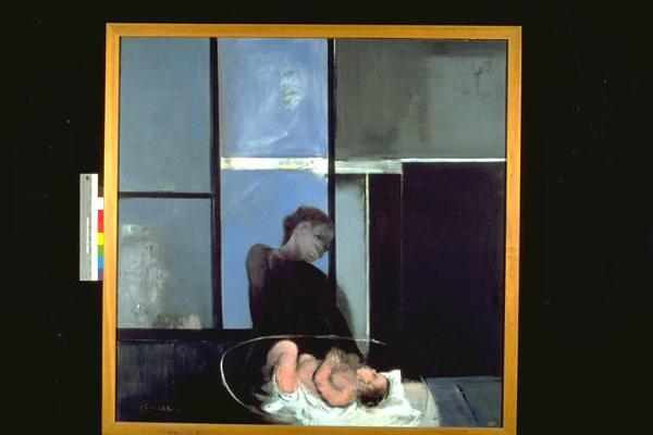 - NOTIZIE STORICO CRITICHE L'opera vinse il maiale al Premio Suzzara 1965. Dipinto di carattere intimista: la figura della madre è resa con tonalità scure, il volto è violaceo con riflessi verdognoli, il corpo si limita ad essere campito uniformemente di nero. Lo sguardo perso nel vuoto evidenzia la preoccupazione e forse la solitudine del personaggio. Lo sfondo è costituito da vetrate e pareti geometricamente delineate, che ricordano lo stile costruttivista, sempre in tonalità spente. Solo il frammento del neonato e del suo lenzuolo emerge, grazie ad una luminosità che fa quasi luccicare le manine.\nL'artista nasce a Giulianova (TE) nel 1923. Reggiano d'adozione, arriva a Reggio Emilia nel 1947. Sorretto da uno spiccato senso del colore, è un artista decisamente prolifico e le sue opere sono molto diffuse tra collezionisti e mercanti. Il suo stile spazia dal neorealismo degli anni Cinquanta all'informale dei periodi successivi, sempre attento a recepire nuovi suggerimenti e a cimentarsi in altrettante proposte.