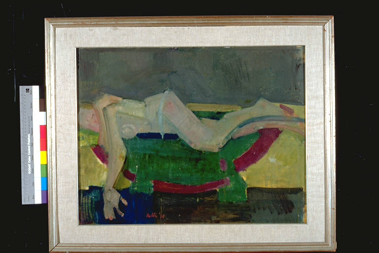 - NOTIZIE STORICO CRITICHE Al XXIII° Premio Suzzara (1970) vinse il premio acquisto.\nL'opera si riallaccia alle esecuzioni fauves: i colori sono squillanti e determinano piatte campiture, la figura della modella è rappresentata sommariamente, senza alcun tipo di descrittività: evidente sono soprattutto le posizioni degli arti. La pennellata è varia e generalmente scomposta.\nL'artista nasce a Massa Lombarda (RA) nel 1919. Nel 1941 inizia a frequentare l'Accademia di Belle Arti di Bologna . Quando si diploma, nel 1946 gli viene affidato l'incarico di rifiondare la Scuola Comunale d'Arti e Mestieri del paese natale, e nel frattempo insegna alle scuole medie. Tra il 1955 ed il 1956 lavora a Milano operando in campo pubblicitario, decorativo e ritrattistico. Ritornato nel paese d'origine, per qualche tempo è docente al Liceo Artistico, dove insegna figura, e, dal 1960 , ornato disegnato; in seguito, ottiene la cattedra di pittura all'Accademia di Belle Arti. E' presente in questi anni in alcune rassegnenazionali e regionali, ottenendo numerosi riconoscimenti, tuttavia manifesta sempre scarso entusiasmo verso le esposizioni. Affronterà numerosi viaggi di studio: in Spagna, in Russia, a Londra, in Svizzerae soprattutto a Parigi. Guarda anche con interesse ad Ensor e Munch, a Soutine, e approfondirà il contatto vivace con Mattia Moreni. Nel 1969 restaura gli affreschi del soffitto del Teatro alla Scala. Importanti sono i suoi nuclei di opere degli anni settanta e Ottanta: figure, ritratti, e molte nature morte: temi mai abbandonati e motivi fondamentali della sua ricerca nel perseguire la qualità della pittura.