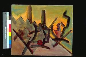Lotta di classe. Stilizzato paesaggio industriale, con elementi segnici in primo piano