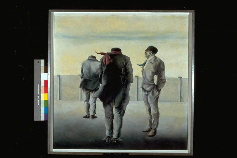 Tre operai. Due figure maschili di spalle ed una di profilo