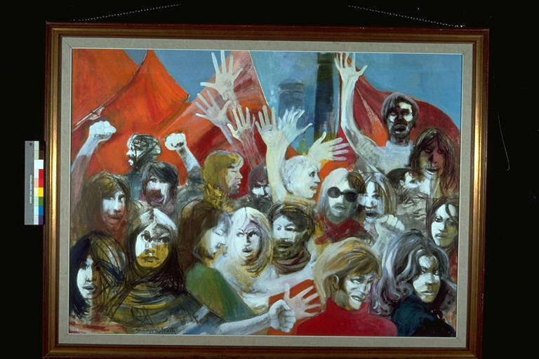 - NOTIZIE STORICO CRITICHE L'opera venne donata dall'autore in occasione del XXV° Premio Suzzara (1972).\nOpera tipica della fase anni Settanta dell'artista: l'impronta realista, che contraddistingue tutta la sua produzione, è evidente, ma la tavolozza è accesa, i colori sono forti e puri, e il bianco è largamente impiegato, a dare risalto a voolti ed atteggiamenti. In alcuni dei visi è rintarcciabile anche una matrice espressionista, ed un certo simbolismo invece nella quantità di mani alzate in segno di giubilo.\nL'artista nasce ad Arena Po (Milano) nel 1908 e muore a Milano nel 1988. Si forma all'Accademia di Brera di Milano. Inizialmente si accosta al gruppo dei chiaristi come si vede nei suoi quadri risalenti alla metà degli anni '30. Durante la guerra, combatte come partigiano. Dopo, assieme a Tettamanti, Fumagalli, Ramponi, Scalvini, fu tra gli animatori del movimento realist di Milano presso la Galleria di Borgonuovo. Nel 1943 tiene la sua prima personale a Piacenza ed altre due a Milano. Partecipa al Premio Suzzara, al Premio Marzotto, alla VII Quadriennale di Roma e a moltissimi altri premi, dove ottenne numerosi riconoscimenti. Durente gli anni '70 ed '80, tiene personali in tutta Italia. Inizialmente il suo linguaggio artistico si ispira al post-cubismo ed all'espressionismo (specie per le figure femminili), poi si fa più esplicitamente realista, rappresentando periferie urbane, braccianti e mondine. Dalla metà degli anni '50 ritrae, quasi unicamente, gente del Po. Negli anni '70 usa colori sempre più acesi, ed il paesaggio acquista sempre più autonomia.